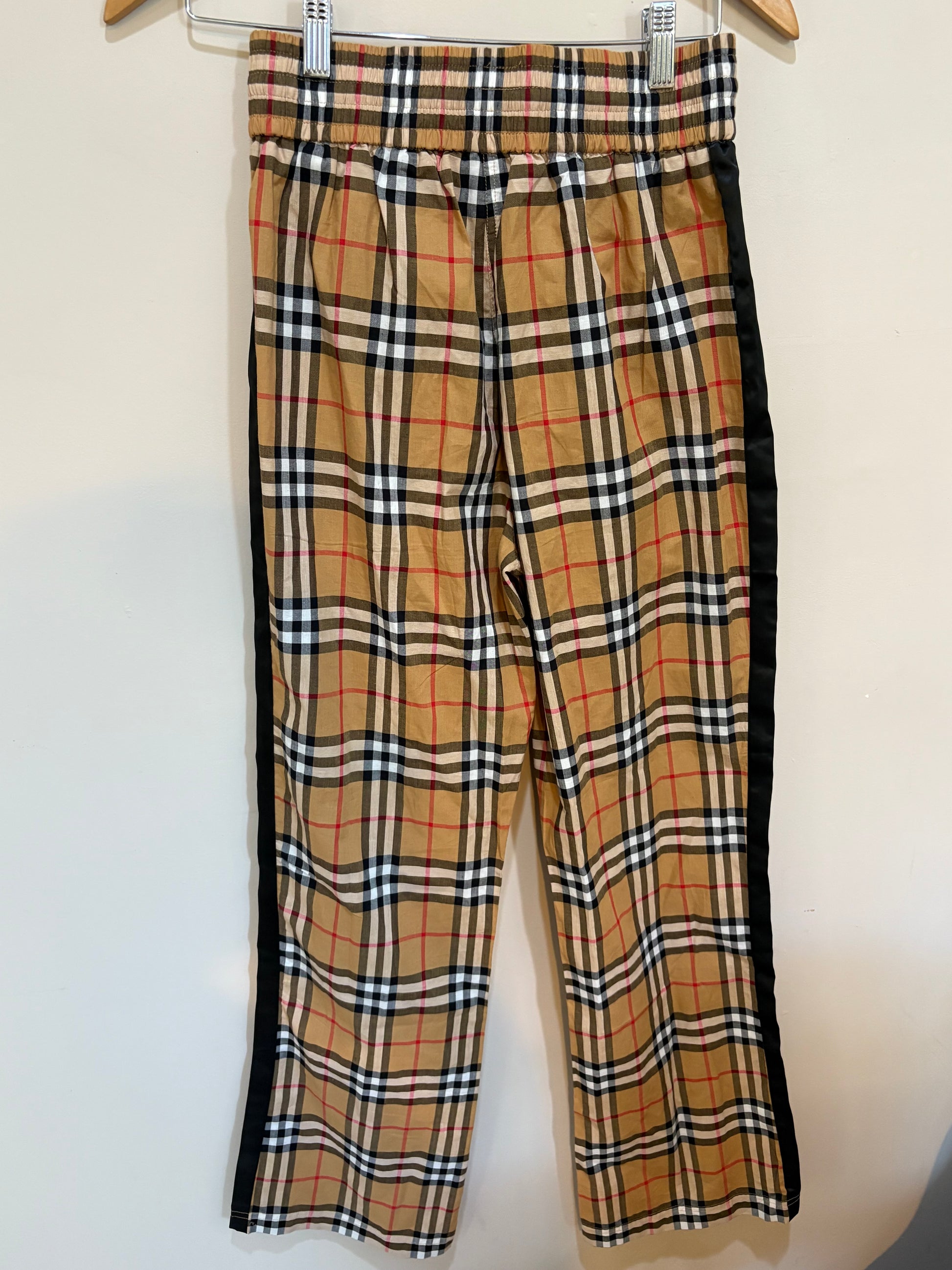 Authentic Burberry women’s trousers in the iconic Vintage Check (Archive Beige). Relaxed straight-leg silhouette with elasticated waistband and adjustable drawstring for an effortless, comfortable fit. Finished with a contrasting black side stripe.