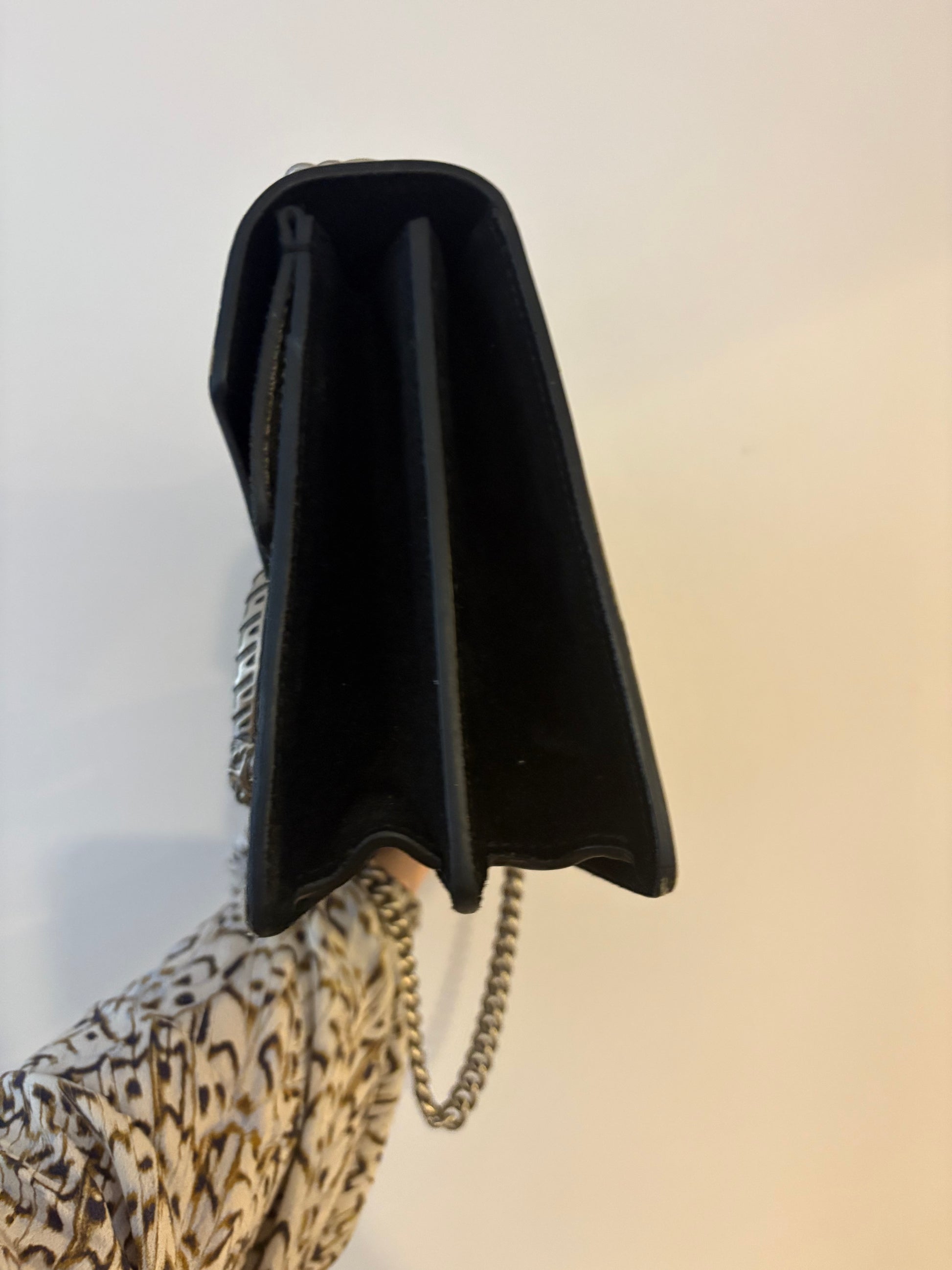 Crafted in GG Supreme coated canvas with black suede trim and finished with a silver-tone chain strap, this bag is both timeless and edgy — perfect for day-to-night wear.