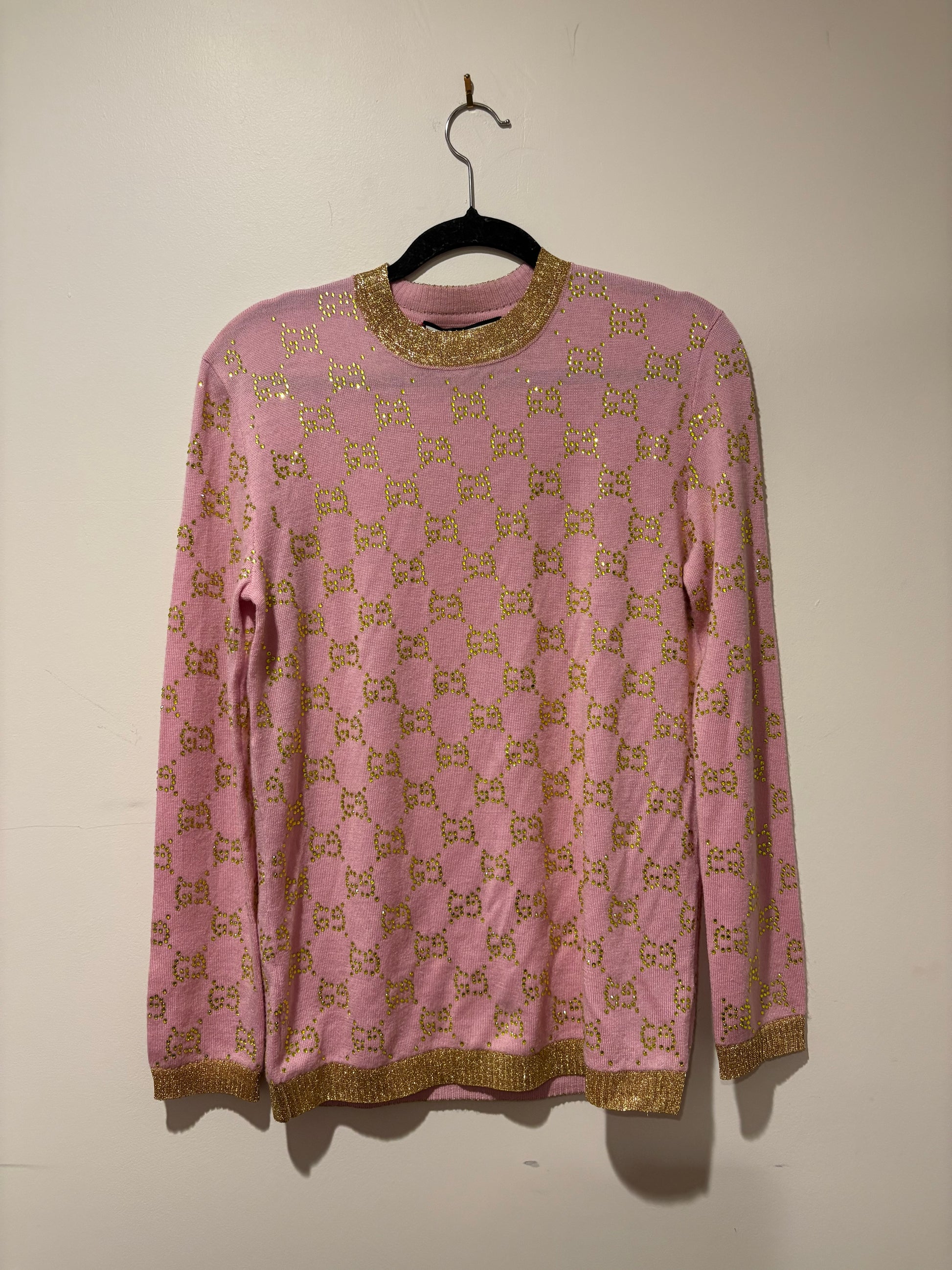 Crafted in a soft dusty pink knit and finished with metallic gold ribbed trim at the neckline, cuffs and hem, this piece captures Gucci’s maximalist era — bold, feminine and unmistakably statement.